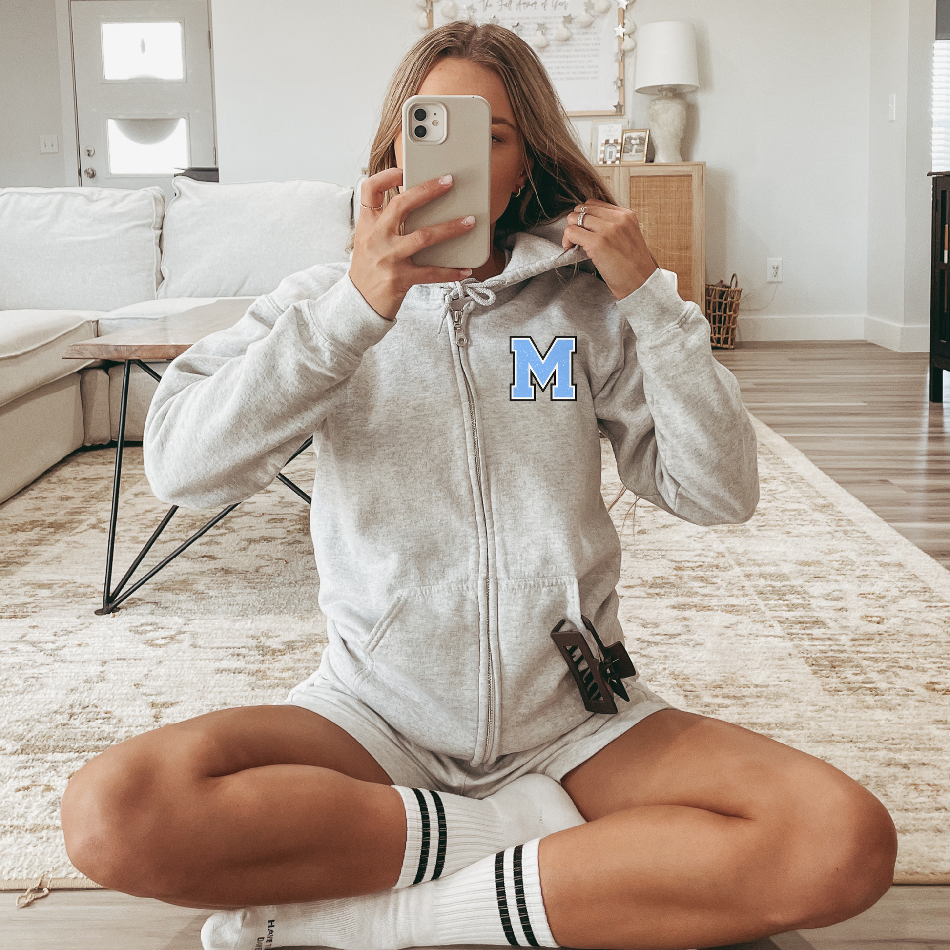 Full zip sweatshirt features iconic Mahwah "M" on the front and fun, trendy mouth design with "volleyball" on the back!