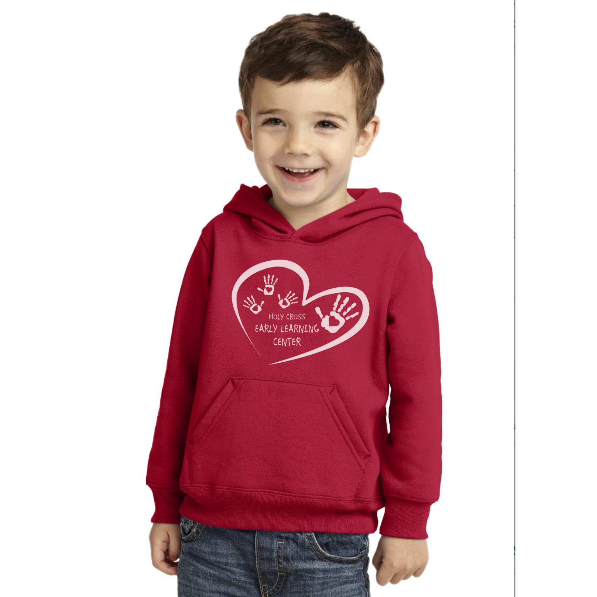 Support for your favorite pre-school with this toddler hooded sweatshirt featuring the Holy Cross Early Learning Center's logo!