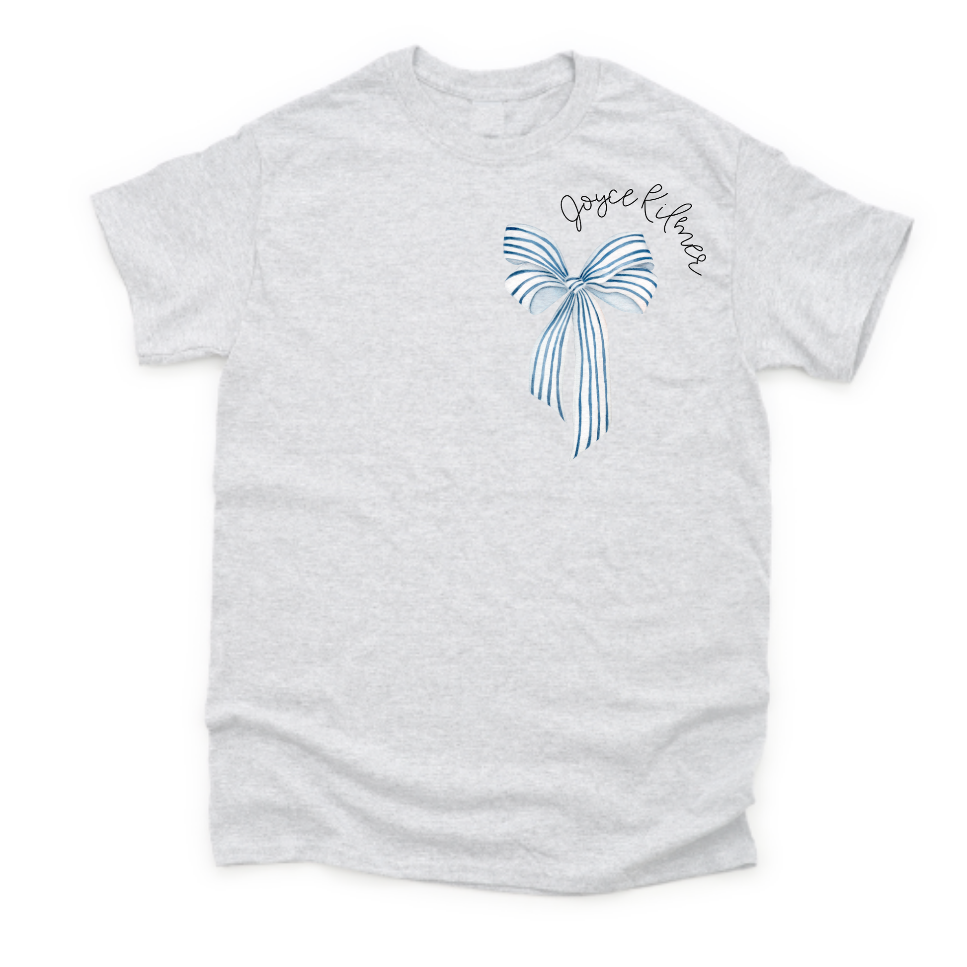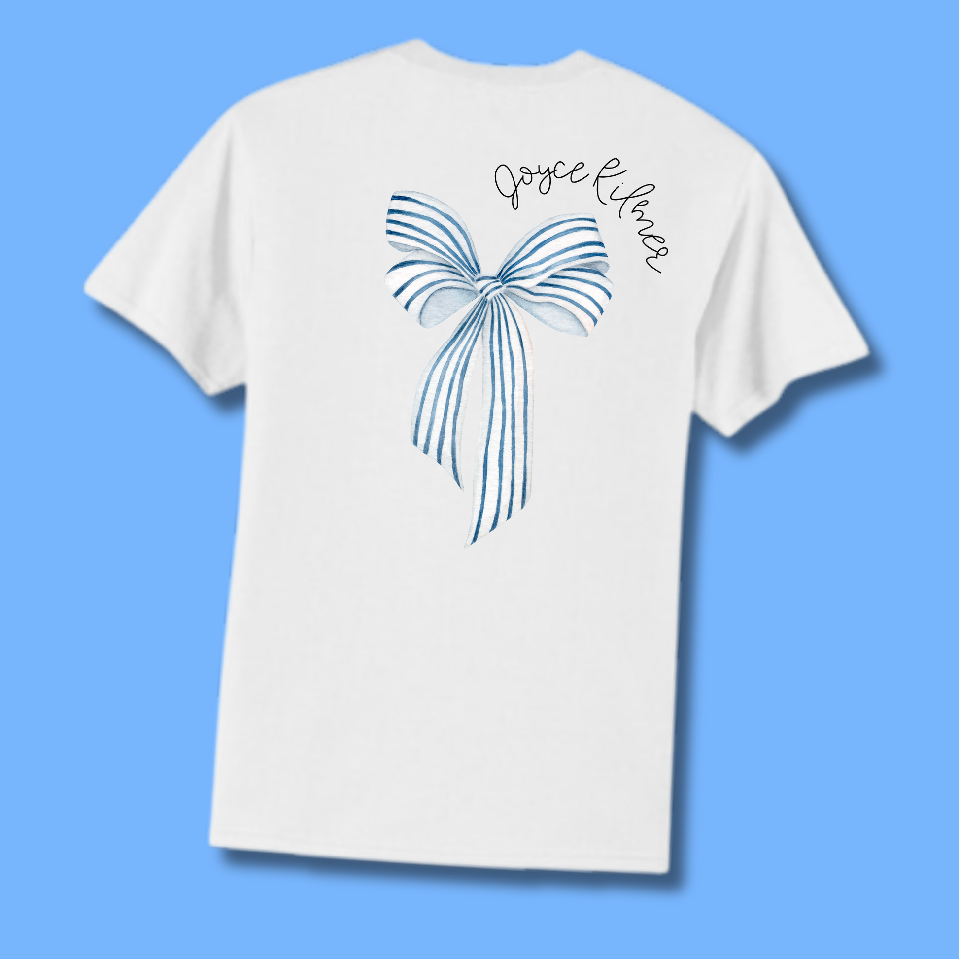 Make a stylish statement and support Joyce Kilmer School with this adorable tee! Featuring "Joyce Kilmer" arched around a classic bow, this shirt is perfect for showing off your school pride. Adding a touch of flair, the front showcases a charming accent bow detail, making this tee a unique and playful addition to any wardrobe.